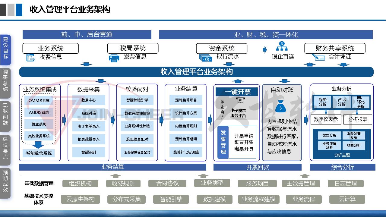收入管理平台项目的建设核心是以业务为主线,对接前端业务系统,按照业务类型场景化建设,实现流程与数据双驱动,将各项收入业务纳入统一平台管理、统一功能入口、统一数据标准,实现收入结算实时化、决策分析自动化。