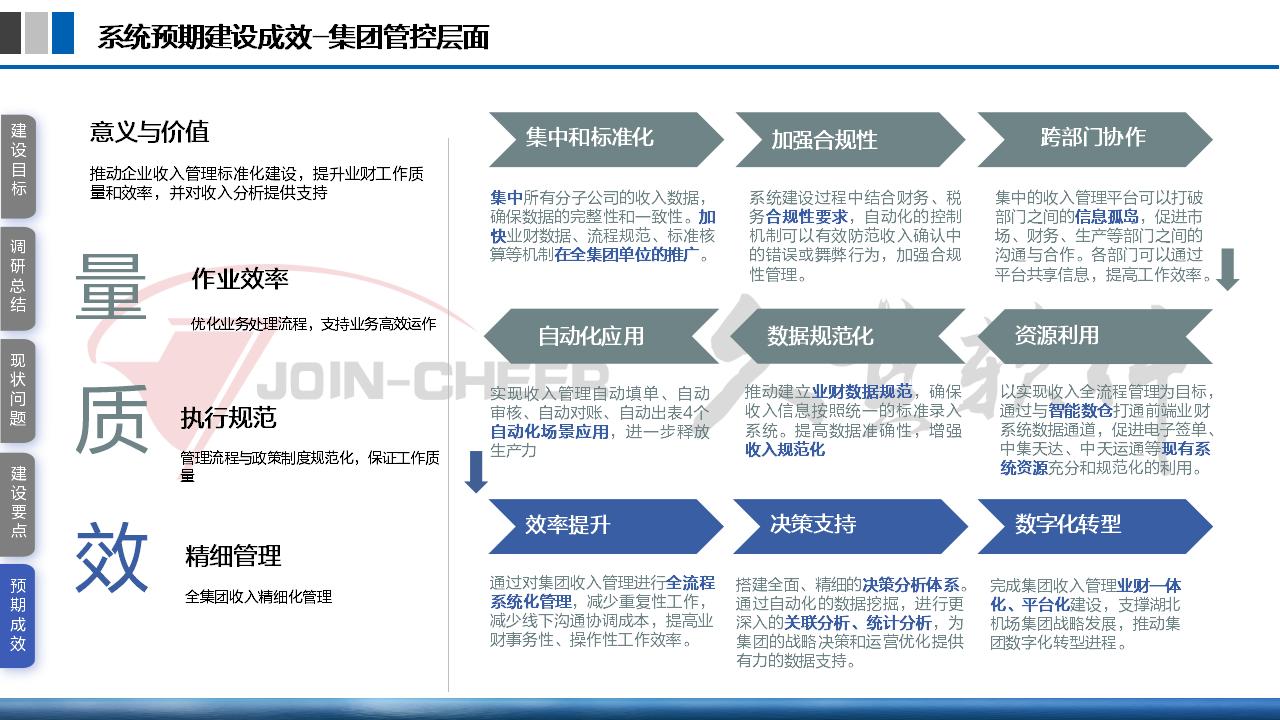 同时收入管理平台项目统一管理集团公司及各成员企业全部收入,有效解决数据分散管理、重复投资、管理边界不清的问题;结算功能更加完备,应用场景更加完善,解决系统功能单一、财务数据与业务数据融合不足的问题。同时分析能力的进一步加强,有效提升了结算管理效率、分析预测准确性及决策支撑力度;理顺业务数据管理流程,将集团成员企业分散的业务系统数据全部纳入收入管理平台实现统一管理,与财务数据形成强关联性。