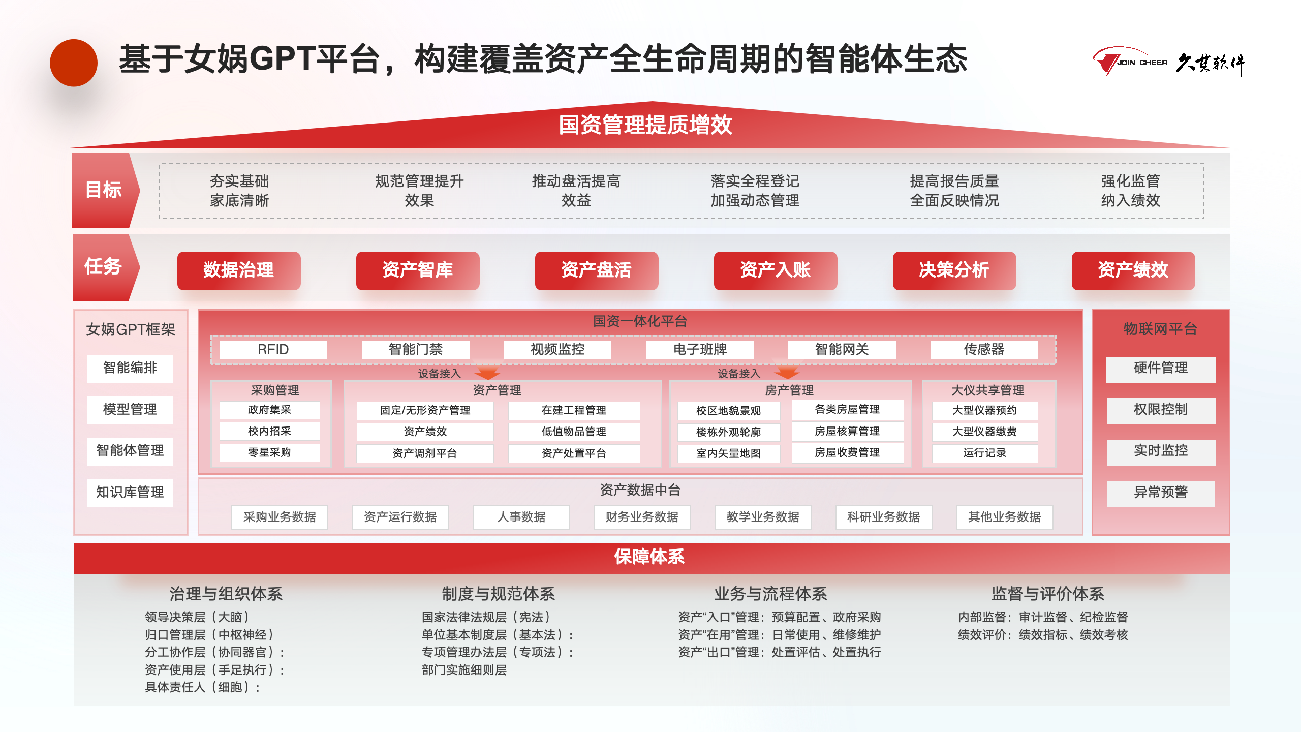 久其AI智能体生态基于久其女娲GPT平台构建,打通采购、财务、人事等多维度数据,通过RFID、智能传感器等硬件实现资产实时监控,依托稳固的技术平台与数据中台支撑,部署了覆盖多业务场景的六大智能体能力,为国资管理质效跃升注入新动能。