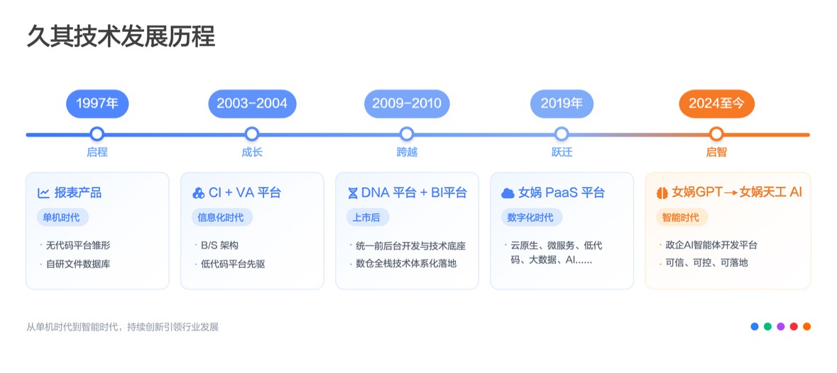 时间来到2024年。大模型技术浪潮汹涌,AI时代的大门已然敞开。久其,依然是那个追光者。2024年初,我们发布了女娲GPT 1.0。而到本月底,我们即将迎来一次全新升级——女娲天工AI平台。这,是久其技术人在智能时代交出的最新答卷。从报表到平台,从数据到智能,变的是技术形态,不变的是我们“让业务更智能、让管理更简单”的执着。