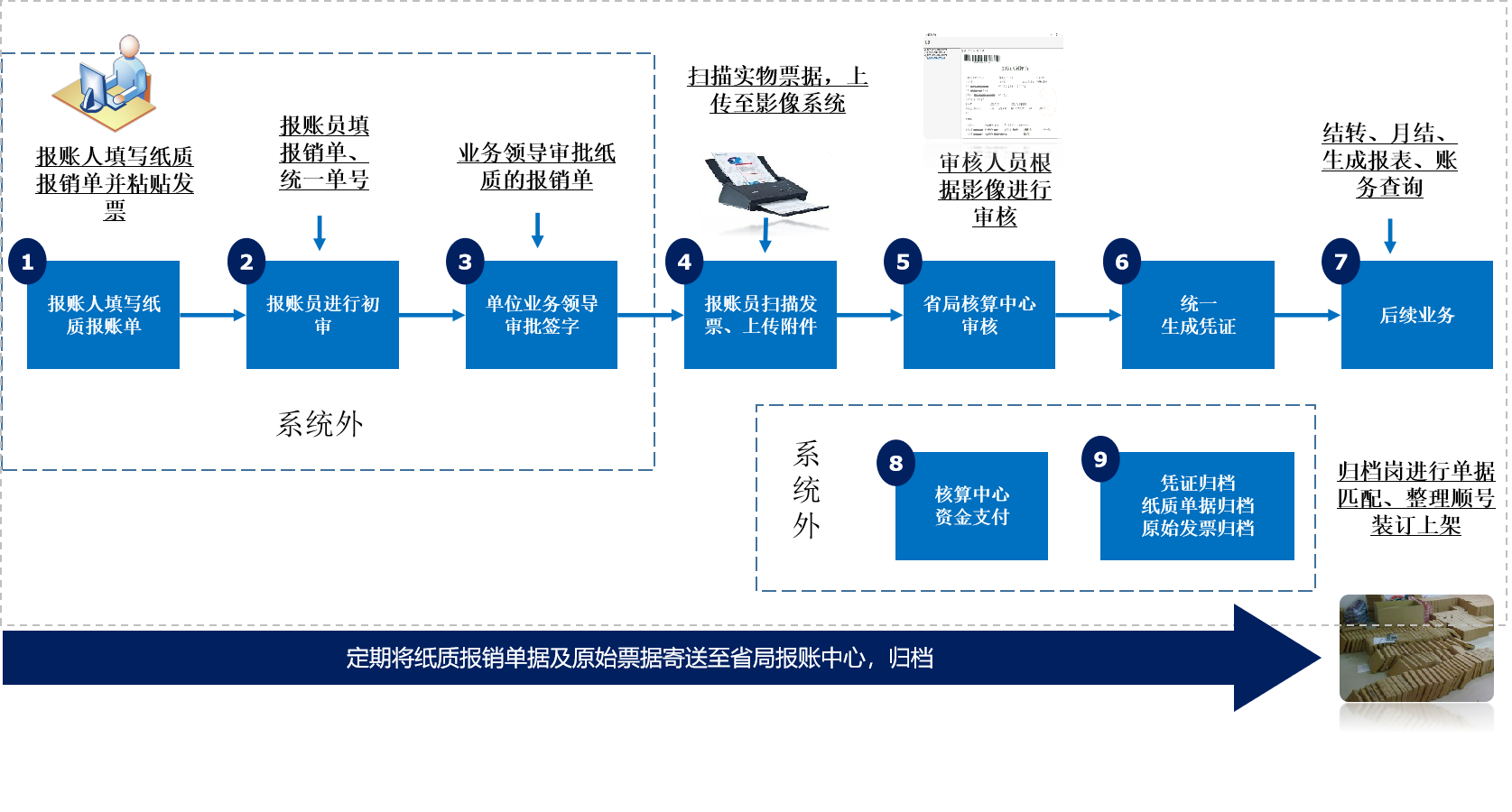 4、 相关领导审批签字后,报账经办人将纸质报账单再次递交给报账员,报账员扫描实物单据、原始凭证等信息,上传到影像系统,并提交到省局报账中心;