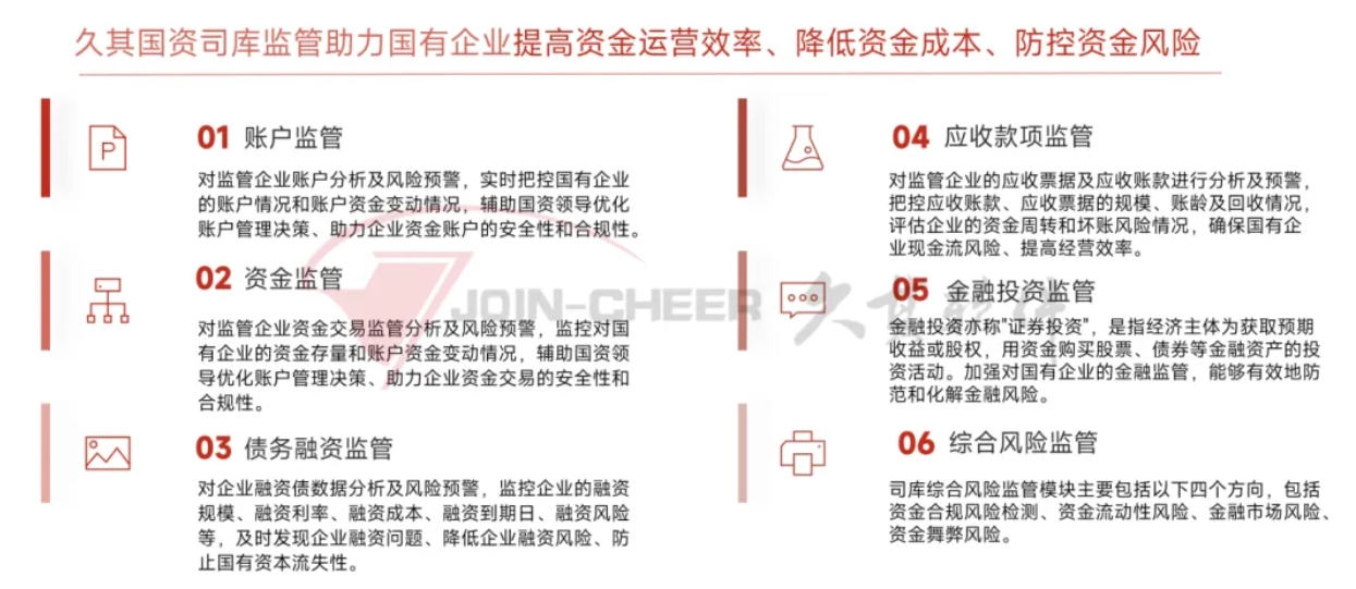 久其软件紧紧围绕企业端司库建设的内容模块,结合自身积累的国资业务经验及国资监管项目经验,对国资司库监管方向有了新认识。国资委端的司库建设内容应与1号文件中针对企业司库提出的11项核心建设内容相呼应,涵盖到账户监管、资金监管、债务融资监管、应收款项监管、金融投资监管、综合风险监管等核心监管模块。