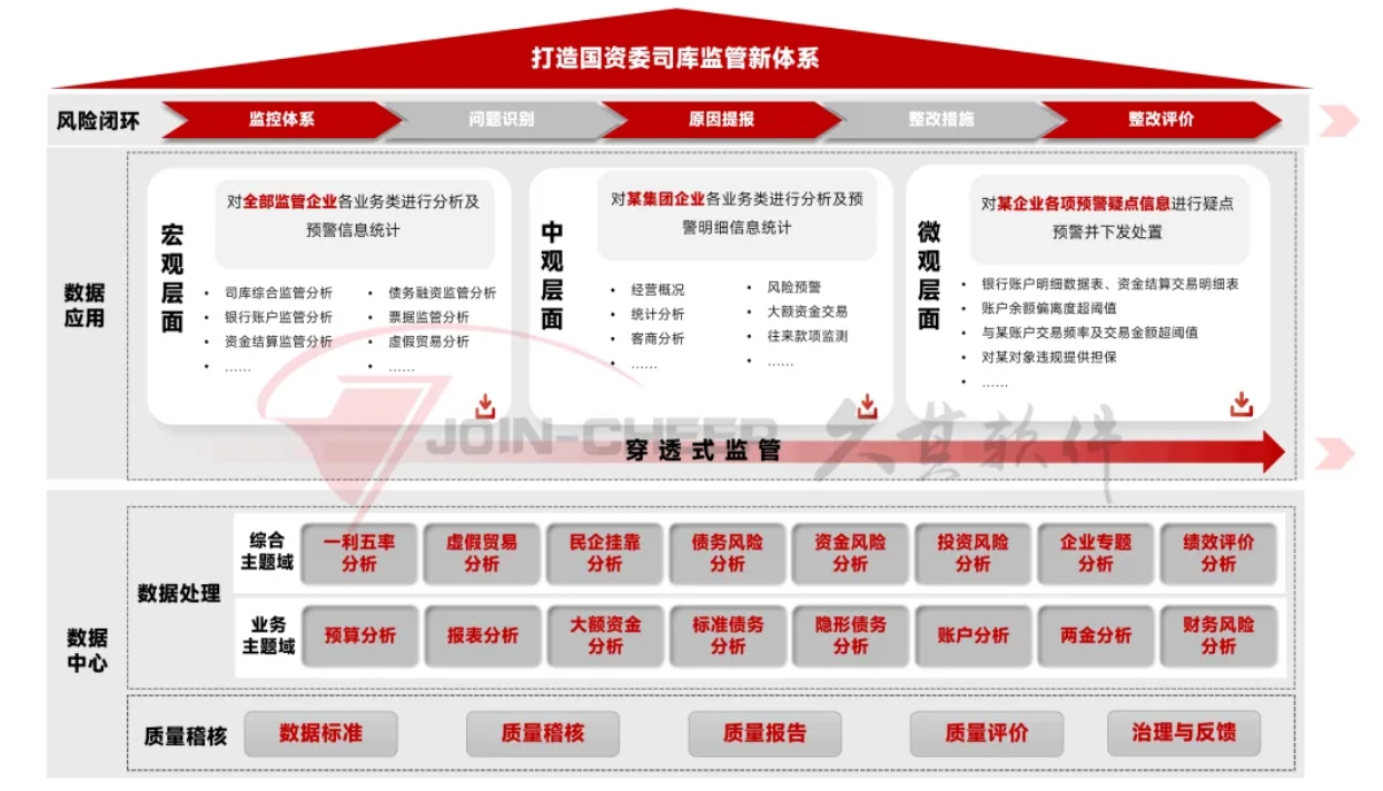 国资委端司库监管体系建设以“数据中心、数据应用平台、风险闭环、穿透式监管”为核心,通过搭建指标体系、数据标准与司库数据库,实现从企业全级次到明细的多层次数据穿透,强化宏观到微观的风险管控能力。围绕“穿透式监管”理念,建立全面覆盖、全链条的监管机制,厘清企业业务实质、资产状况和法律关系,依法依规实施精准监管。同时,与企业侧司库体系联动,打造资金风险防控网,为提升监管效能和推动企业稳健发展提供有力支撑。
